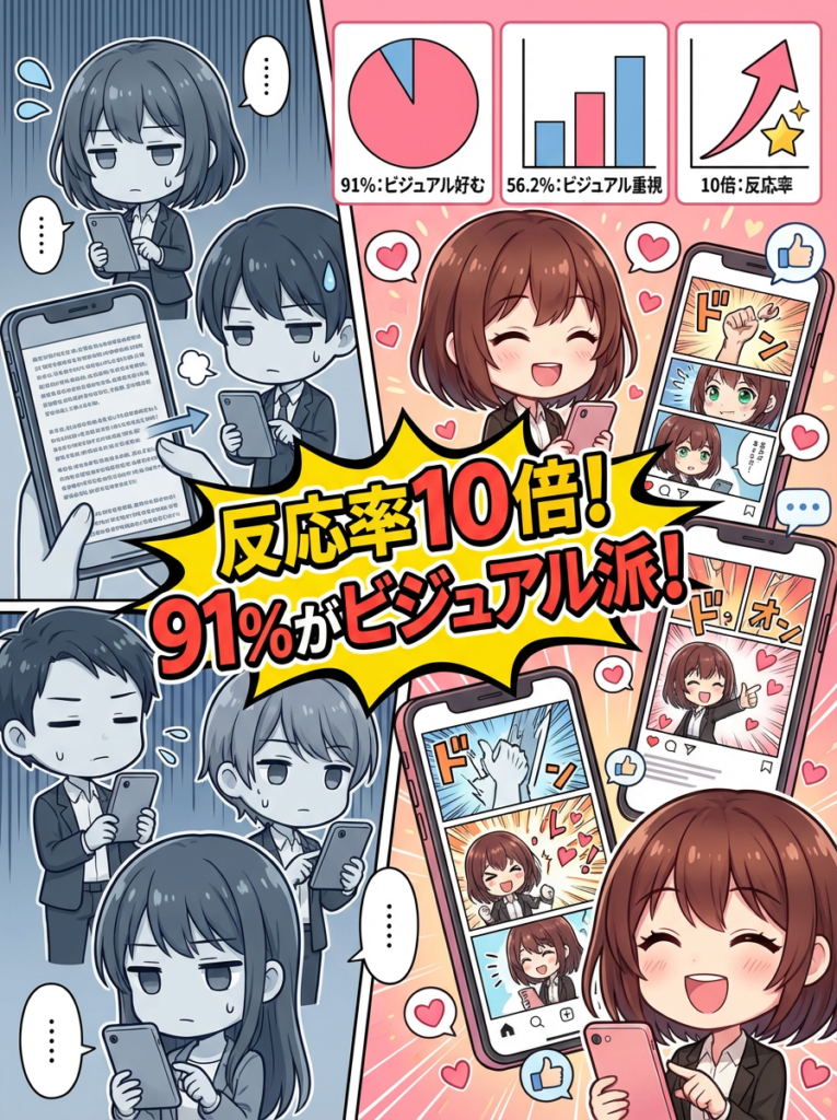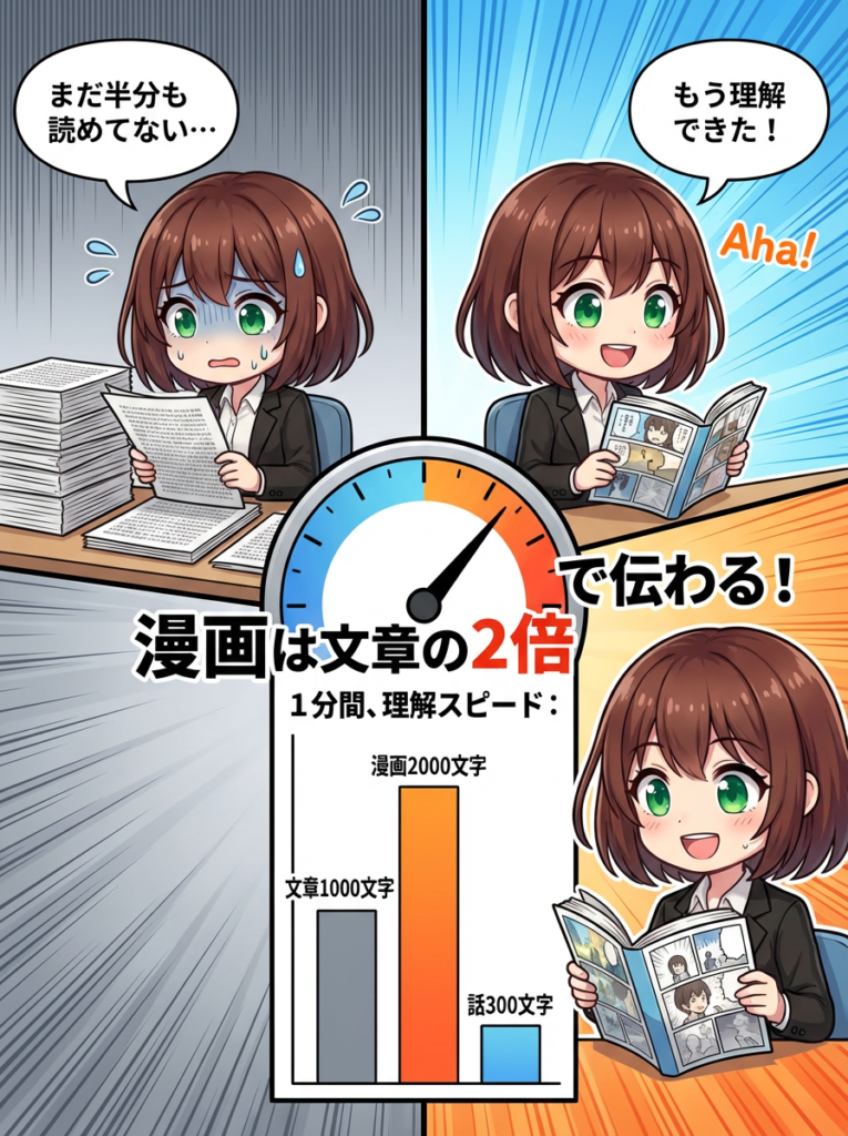 同じ情報でも、見せ方を「漫画」に変えるだけで、ここまで差が生まれるというのは驚きですよね。